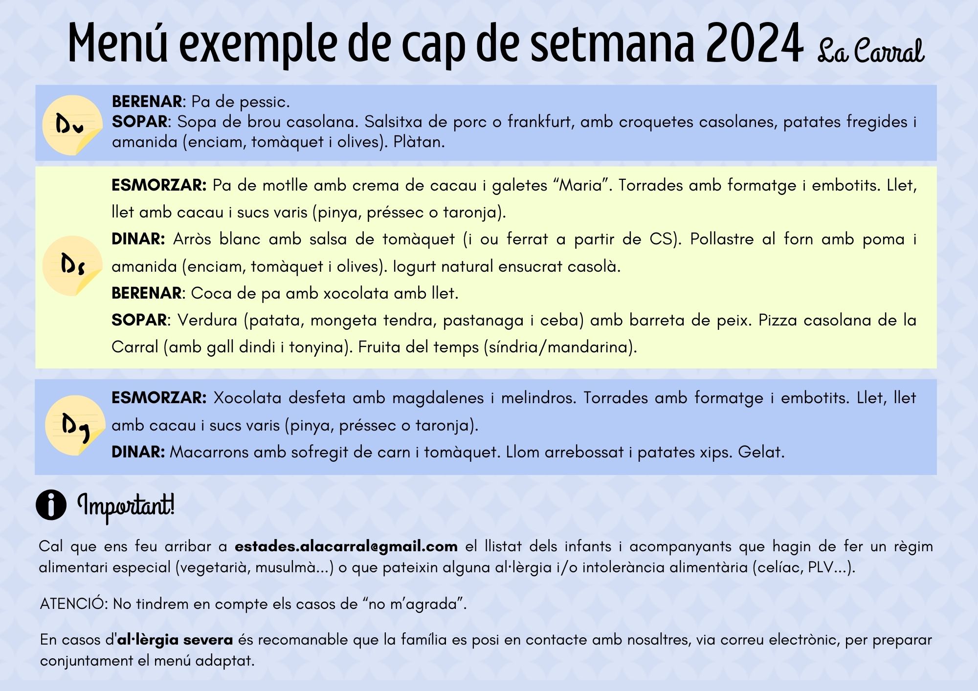 Podeu consultar un exemple de menú d ecap de setmana i alguns dels menús adaptats als següents enllaços:
